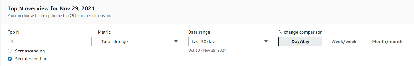2.5: l'ultima sezione della scheda Panoramica consente di eseguire un'analisi di tipo Primi N di un parametro in un intervallo di date, in cui N è compreso tra 1 e 25. Nell'esempio riportato di seguito, abbiamo selezionato i primi tre elementi in ordine decrescente per il parametro Archiviazione totale.