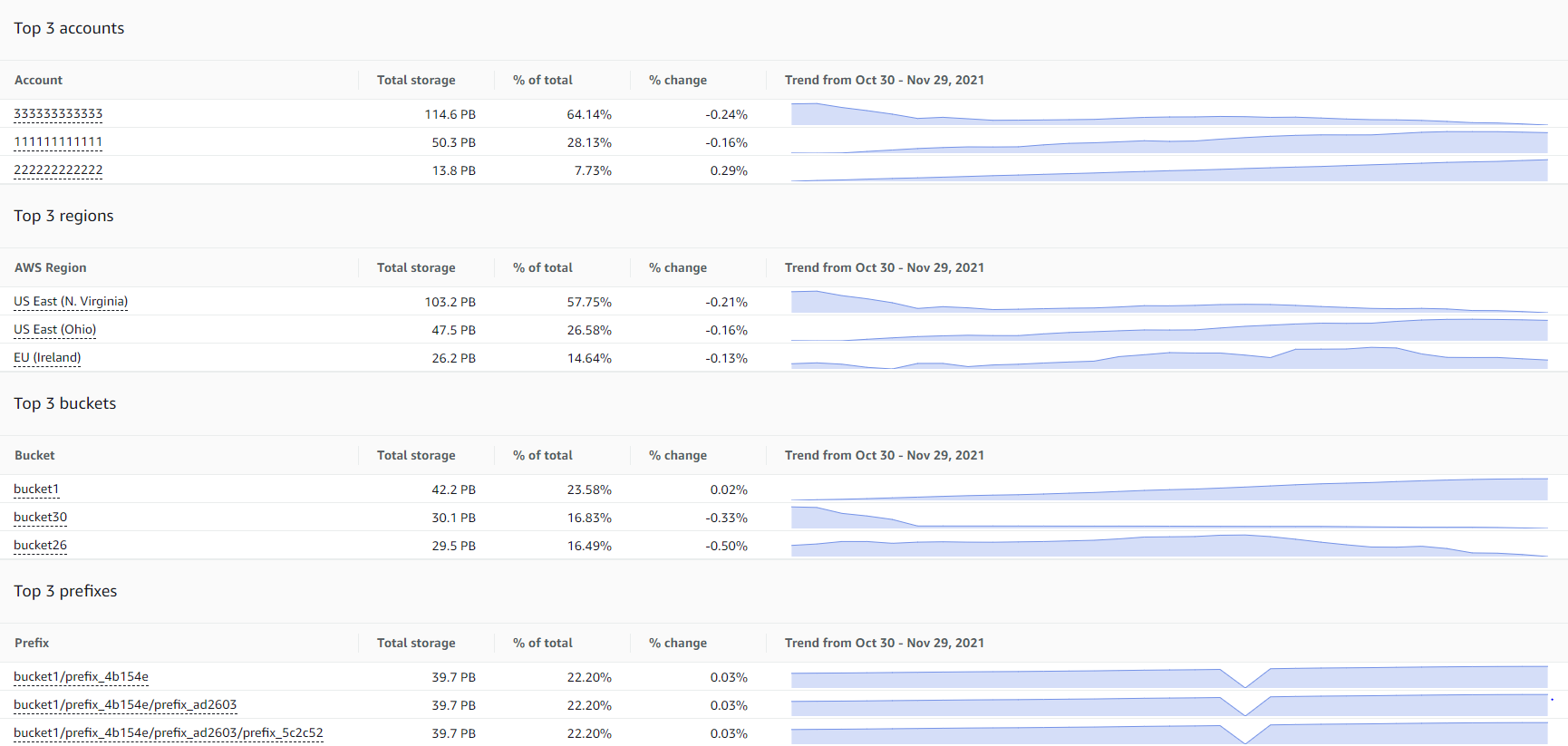 Potrai quindi visualizzare i primi tre account, Regioni, bucket e prefissi in base al parametro scelto, insieme alle tendenze associate.
