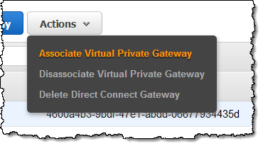 I return to the Direct Connect Console and navigate to the Direct Connect Gateways. I select my Gateway and choose Associate Virtual Private Gateway from the Actions menu:
