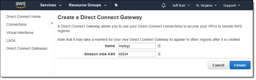 You can create a Direct Connect Gateway from the Direct Connect Console or by calling the CreateDirectConnectGateway function from your code. I’ll use the Console!