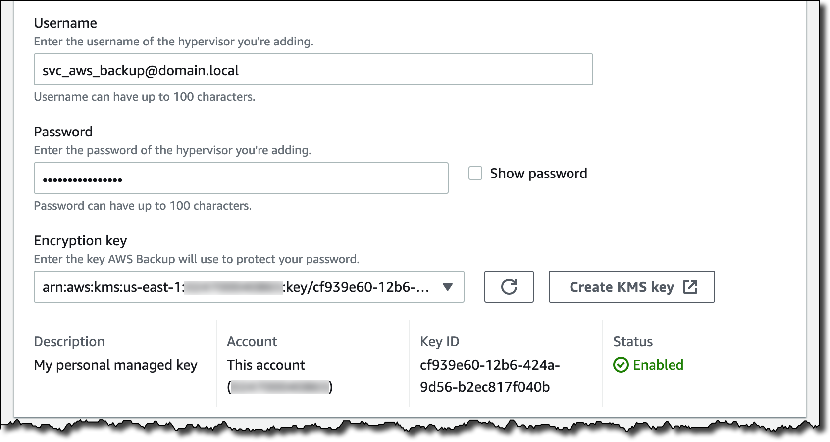 I enter the username and password of a service account that I created for AWS Backup on the Active Directory domain. The username should include the domain (for example, username@domain). Then, I choose the encryption key to protect the service account credentials. If I don’t choose my own AWS Key Management Service (AWS KMS) key, AWS Backup encrypts the username and password using a key that AWS owns and manages.