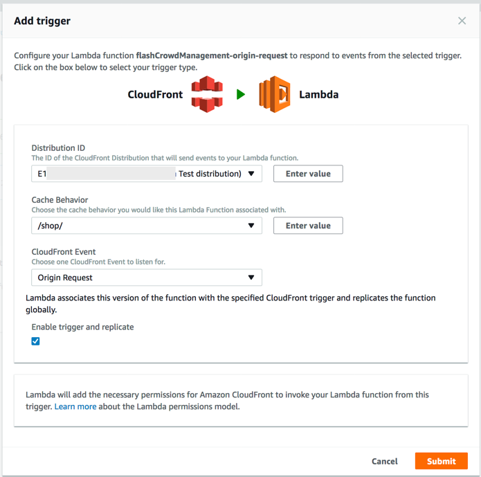 1. In the Lambda console, create a new Lambda@Edge function and then copy into the Lambda function the flashCrowdTrafficManagement.js code that you downloaded and edited in Step 2.