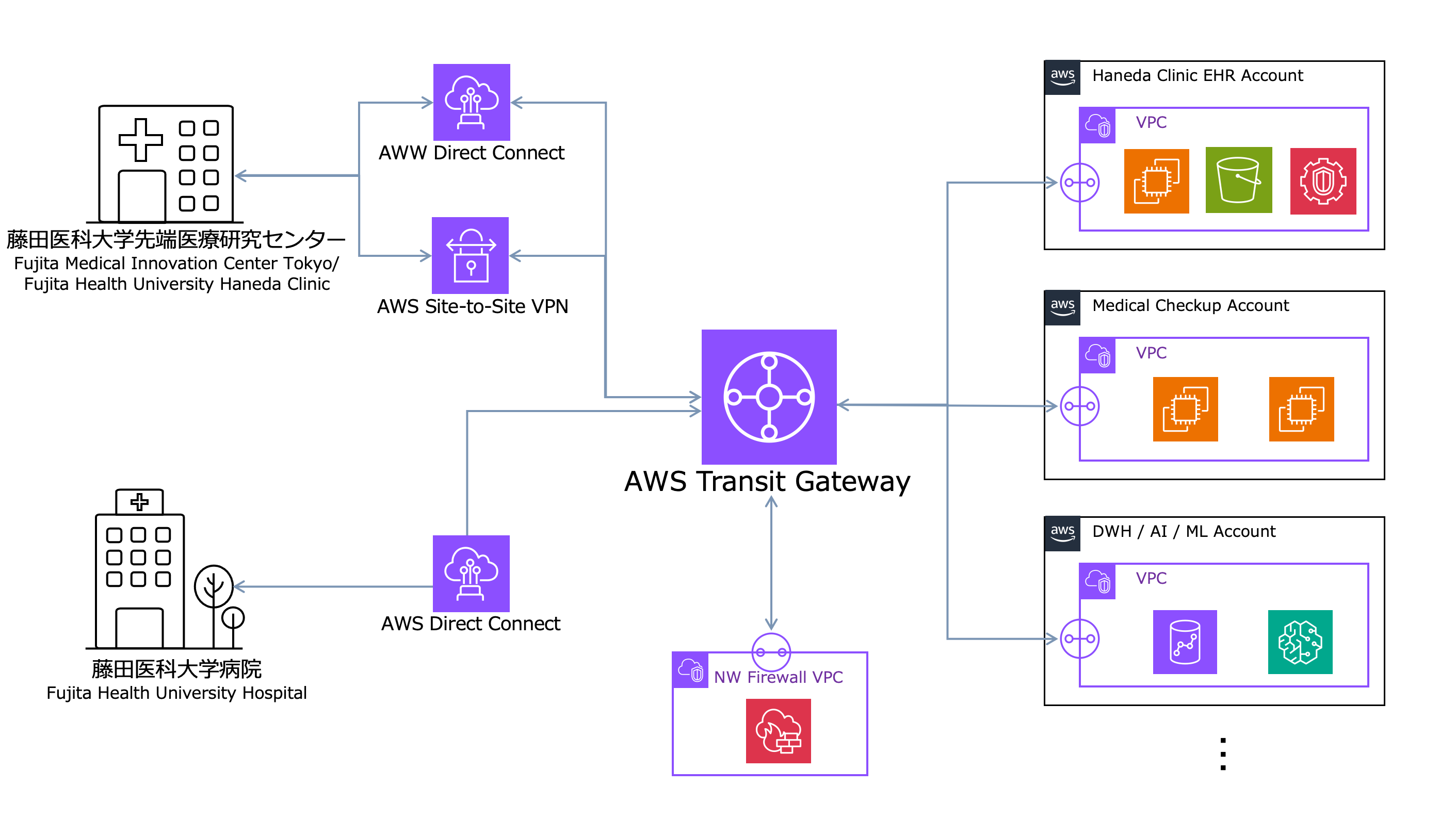また、図の中央にある AWS Transit Gateway のサービスをハブとして利用し、藤田医科大学病院を含めたオンプレミスネットワークとの接続や、右側 2 番目の健康診断システム、3 番目のデータ二次利用基盤へアクセスできます。