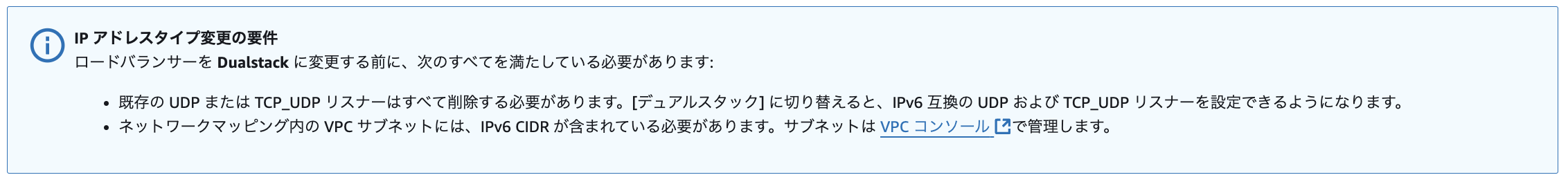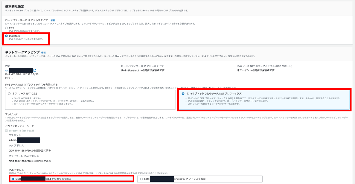 - サブネット IP 設定の確認:NLB のサブネットはデュアルスタックである必要があります。ターゲットグループのサブネットはデュアルスタックまたは IPv6 のみのいずれかです。