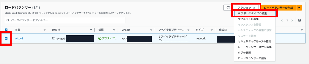 既存の NLB の IP アドレスタイプを更新する場合、Amazon EC2 コンソールのロードバランサーに移動し、対象の NLB を選択します。図3 のように、アクションを選択し、IP アドレスタイプの編集を選択します。