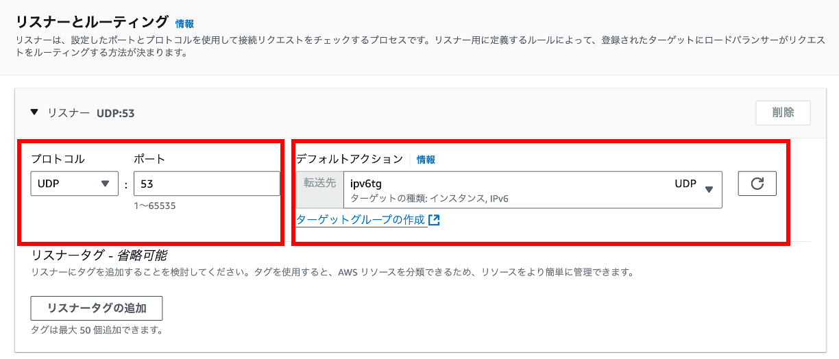 リスナーのプロトコルを UDP または TCP_UDP に設定し、リスナーのポートを選択する必要があります。図の例では、UDP とポート 53 を選択しています。ターゲットグループの IP アドレスタイプの値は IPv6 に設定する必要があります。ターゲットグループの IP アドレスタイプを確認するには、Amazon EC2 コンソールのターゲットグループを参照してください。ターゲットグループの IP アドレスタイプは作成後に変更できません。図10 は、上記例における IPv6 ターゲットグループの UDP リスナー設定を示しています。