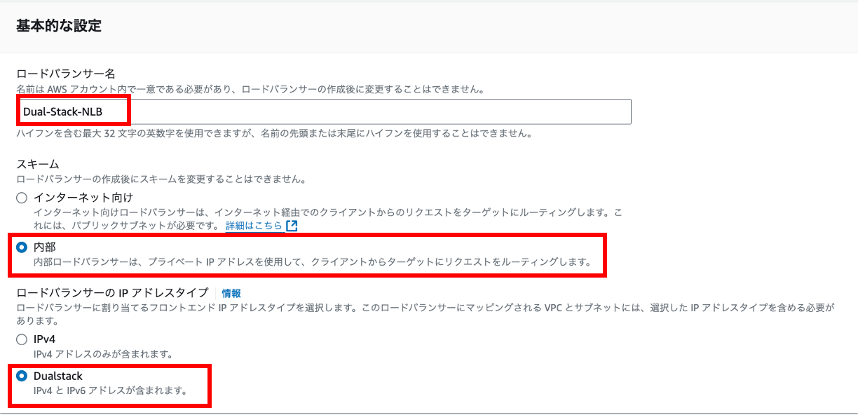 UDP リスナーを持つ新しいデュアルスタック NLB を作成するには、Amazon EC2 コンソールのロードバランサーに移動し、ロードバランサーの作成を選択します。Network Load Balancer を選択し、作成を選択します。基本的な設定で、NLB に一意の名前を付け、スキーム (内部またはインターネット向け) を選択します。ロードバランサーの IP アドレスタイプでは、デュアルスタックを選択します。図5 に例を示しています。