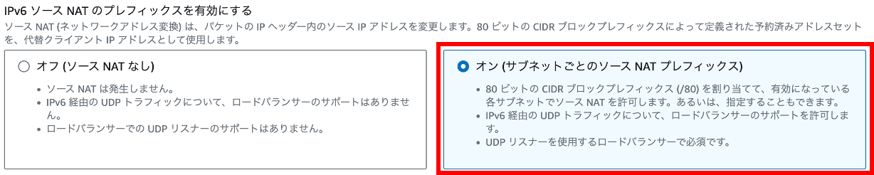 NLB を変更し、ロードバランサーの IP アドレスタイプをデュアルスタックに変更する際、IPv6 ソース NATのプレフィックスを有効にするをオン (サブネットごとのソース NAT プレフィックス) に設定し、サブネットを選択し、ソース NAT IPv6 アドレスを割り当てます。図4 に例を示しています。