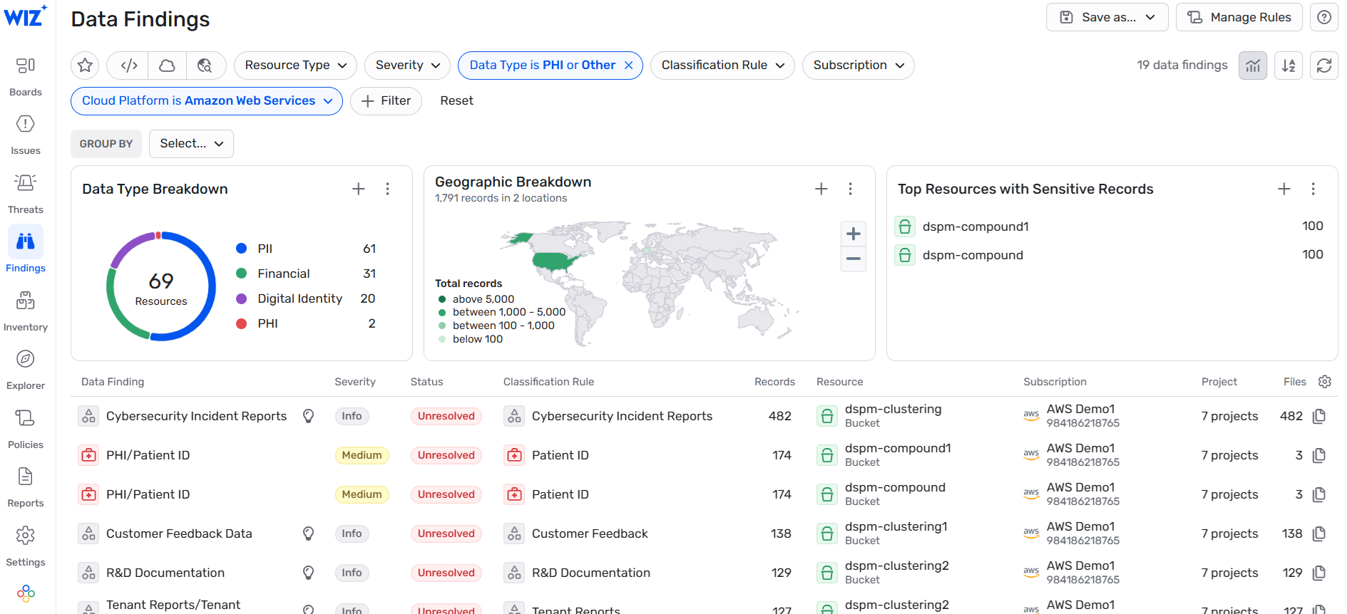 図 2: Wiz は、統合された DSPM 機能を通じてデータ検出を自動化し、データが存在する場所を特定し、検出されたセキュリティリスクの修復に優先順位を付けるのに役立ちます