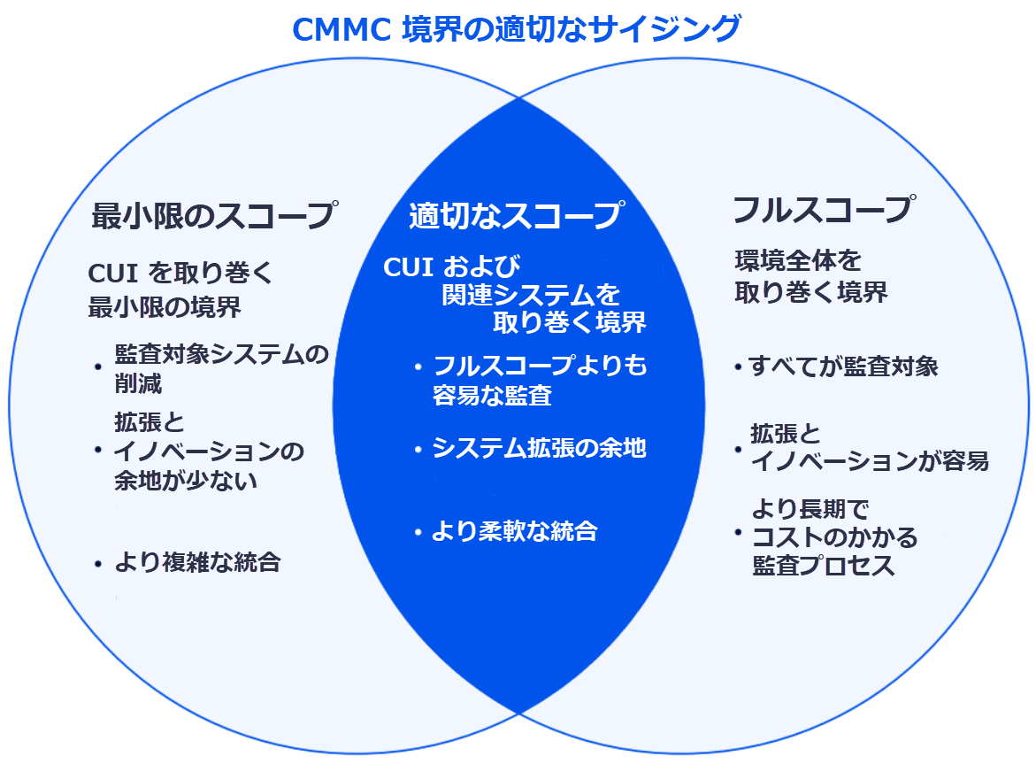 このバランス(セキュリティと俊敏性)は、厳しい予算とスケジュールで作業する政府のコントラクターとサブコントラクターにとって不可欠です。次のベン図は、最小限の境界を持つ厳密なスコープと、すべてを囲む境界を持つフルスコープの交差を示しています。厳密なスコープとフルスコープの重なりを示す中央の領域には、CUI と関連システムの周囲に CMMC 評価境界を配置することの利点がいくつか記載されています。