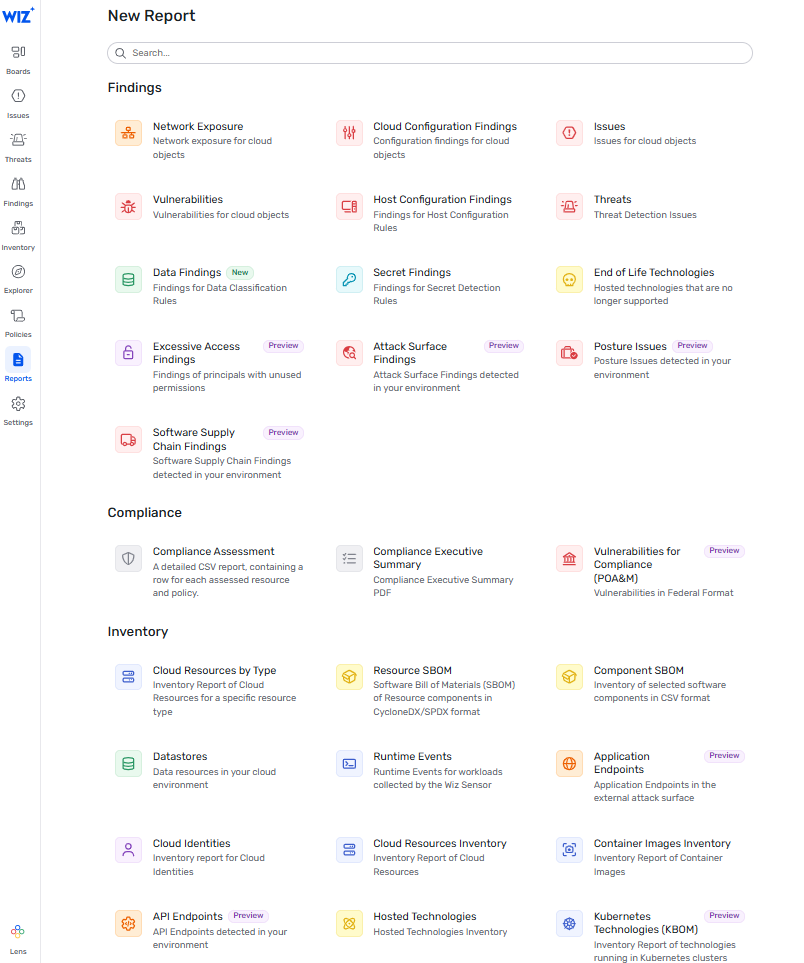 次の画像は、検出結果、コンプライアンス、インベントリレポートを示す Wiz Cloud-Native Application Protection Platform (CNAPP) レポートユーザーインターフェイスのスクリーンショットです。各レポートカテゴリの下には、ネットワーク露出、脆弱性、データ検出結果、コンプライアンス評価、コンプライアンスのための脆弱性、データストア、クラウドリソースインベントリなど、レポートサブカテゴリのオプションがあります。