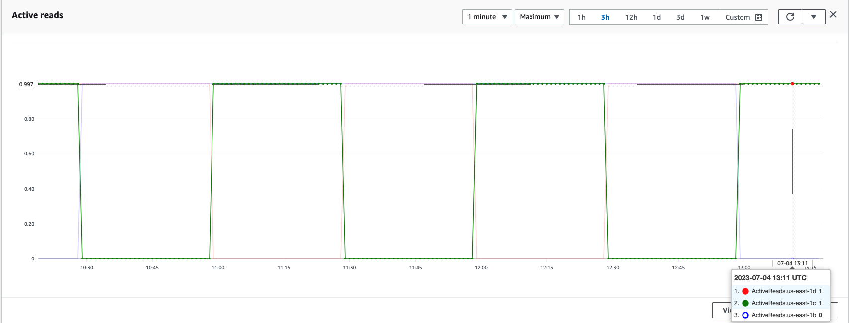 定常状態の運用を維持するために、スタンバイのアベイラビリティーゾーンは 30 分ごとにローテーションされ、すべてのネットワークパーツがアベイラビリティーゾーン全体でカバーされていることが保証されます。このプロアクティブなアプローチは、読み取りパスの可用性を検証し、潜在的な障害時のシステムの回復力をさらに強化します。次の図は、このアーキテクチャを示しています。