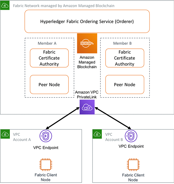 次の図に示すように、ハイパーレジャーファブリックの順序サービス、メンバーの認証局 (CA)、およびメンバーのピアは、マネージドブロックチェーンが管理します。VPC エンドポイントを使用して、それらのエンドポイントを顧客の VPC に公開します。顧客の VPC とマネージドファブリックネットワーク間のすべてのネットワークトラフィックは AWS バックボーンを介して発生し、パブリックインターネットには公開されません。