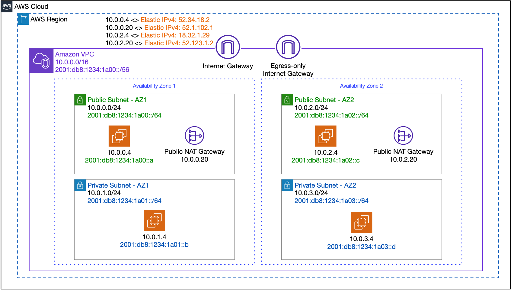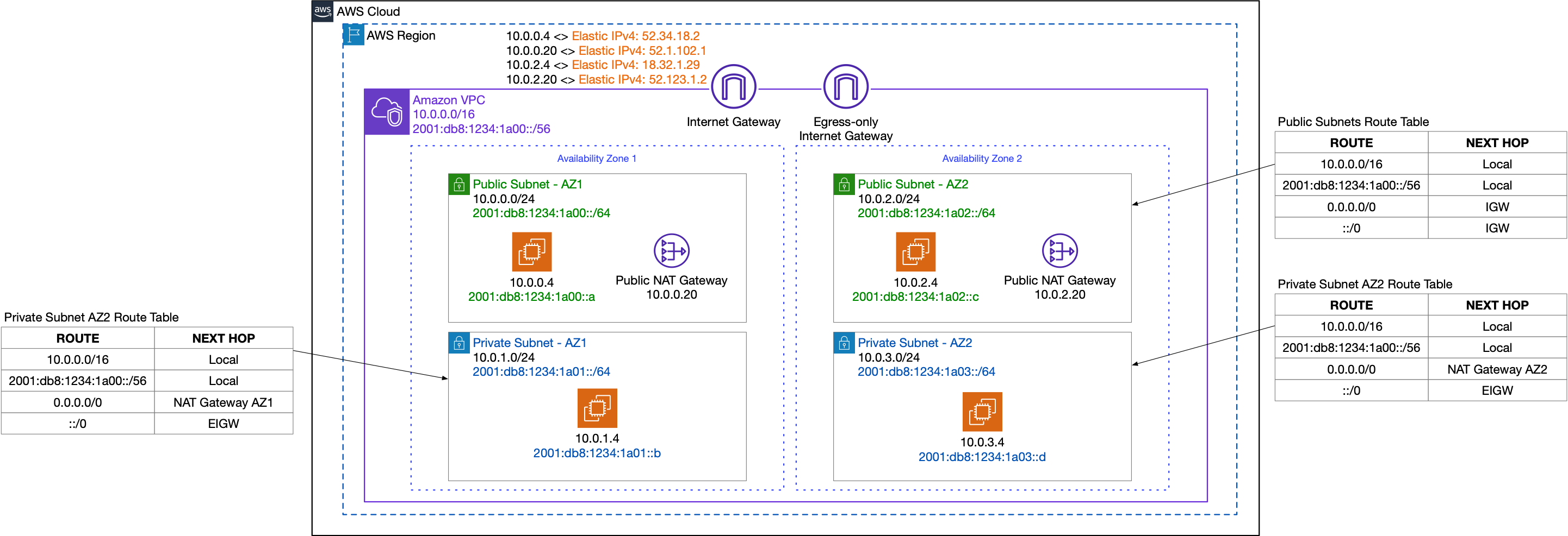 デュアルスタックVPCでは、IPv4スタックには同じインターネット接続構成を維持し、IPv6スタックではEgress-only Internet Gateway (EIGW)を追加します。EIGWは、VPC内のインスタンスからインターネットへのIPv6によるアウトバウンド通信を可能する水平スケーリングされた冗長で可用性の高いVPCコンポーネントです。EIGWの役割は、プライベートサブネットの概念をIPv4とIPv6の両方のスタックで一貫させることです。これは論理的にはNATゲートウェイと非常によく似ており、インターネットからインスタンスへのIPv6接続を開始するのを防ぎ、アドレスやポートの変換に頼らず、リターントラフィックのみがインスタンスに到達するのを可能にします。次の図は、上述のデュアルスタックVPC関連の概念を示しています。
