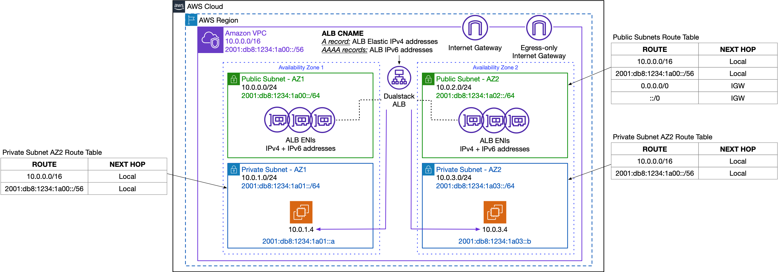 パブリック向けロードバランサーを設定する際に、ロードバランサーが選択したパブリックサブネットで使用するIPアドレスにデュアルスタックを選択することができます。これにより、アプリケーションクライアントはIPv4とIPv6の両方のアドレスを使用してロードバランサーと通信できるようになります。デュアルスタックを選択する場合、ロードバランサーのサブネットにはIPv6 CIDRブロックが関連付けられている必要があります。ロードバランサーのインターフェースにIPv6アドレスを手動で割り当てること(訳者注:ブログ執筆時点ではNLBのみ手動割り当て可能)も、AWSがランダムに割り当てることもできます。次の図は、インターネット向けデュアルスタックALBのデプロイメント、ルートテーブルの設定を示しています。