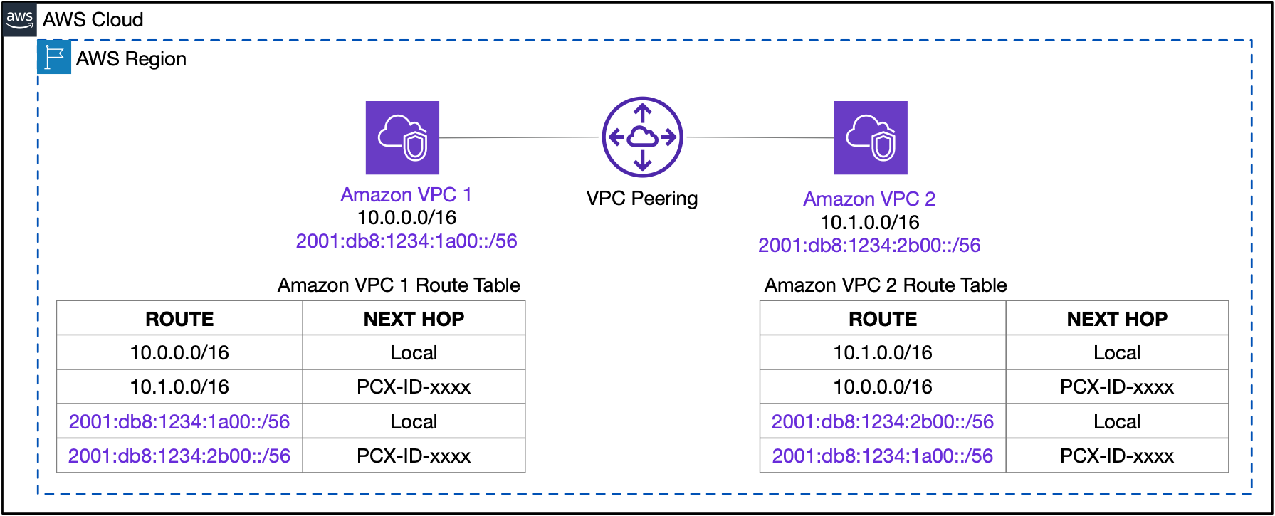 VPCがデュアルスタックに対応し、アプリケーションのエンドポイントがIPv4とIPv6の両方のアドレスでパブリックにアクセスできるようになったところで、デュアルスタックVPCの接続オプションを見てみましょう。2つのデュアルスタックVPCを接続する最も簡単な方法は、VPCピアリングを使用することです(詳細については、VPCピアリングのドキュメントを参照してください)。IPv4のCIDRブロックが重複しない2つのVPCをピアリングし、ピアリング接続を介して単一のスタックまたは両方のスタックをルーティングすることを選択できます。次の図は、デュアルスタックのVPCピアリング接続と関連するルーティングを示しています。