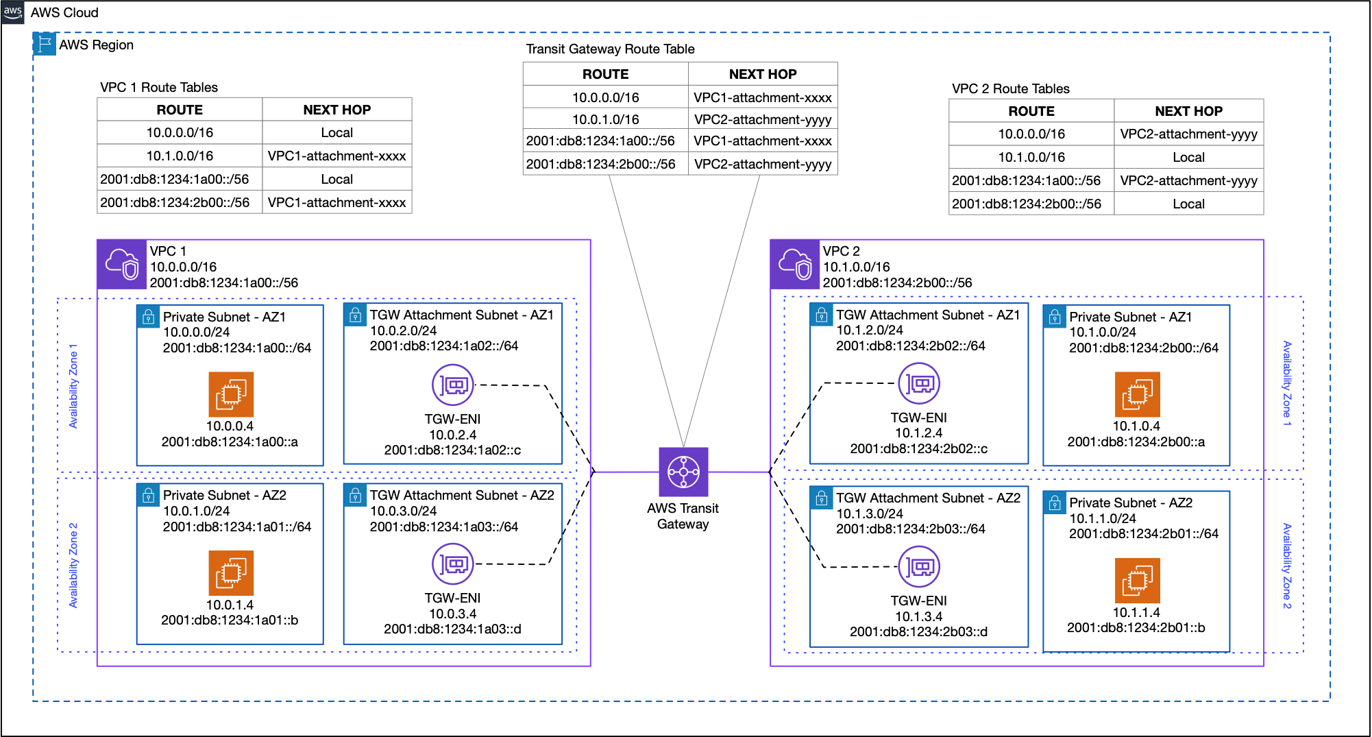 AWS Transit Gateway(TGW)は、単一のVPCの規模を超えて、IPv4とIPv6の両方のスタックのVPCやハイブリッドネットワークを相互に接続するために使用できるネットワークトランジットハブです。アタッチメント、ピアリング接続、アソシエーション、プロパゲーション、ルーティングなど、すべてのTGWのコンセプトと概念は、両方のスタックで同じ機能を備えています。TGWにIPv6対応のVPCアタッチメントを設定するには、VPCとアタッチメントのサブネットにIPv6のCIDRが関連付けられている必要があることに注意してください。また、TGWのピアリング接続は、IPv4およびIPv6のCIDRルーティングをサポートしています。次の図は、デュアルスタックのTGW VPCアタッチメントを示しています。