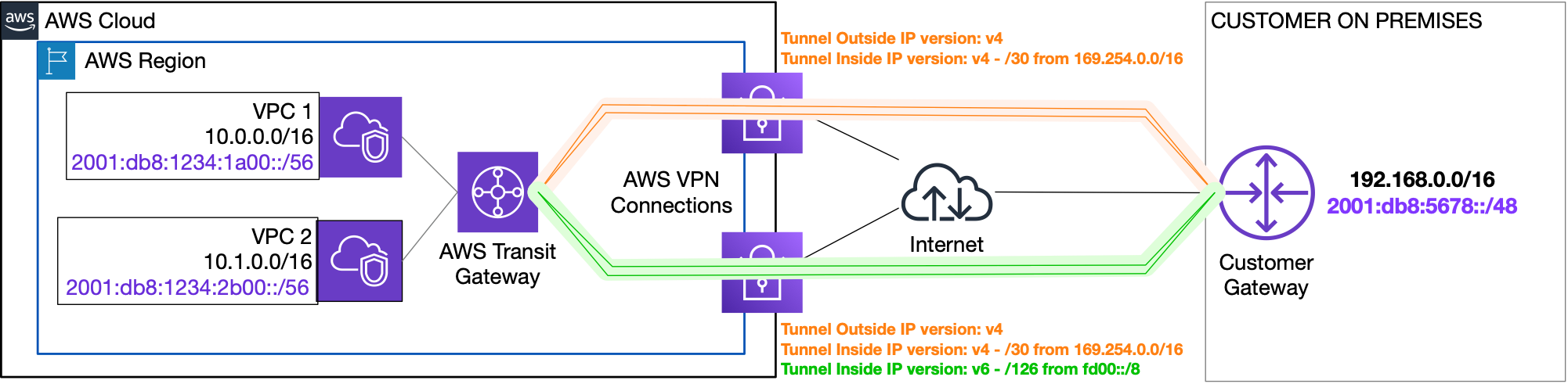 トランジットゲートウェイ上のSite-to-Site VPN接続は、VPNトンネル内でIPv4トラフィックまたはIPv6トラフィックのいずれかをサポートします。つまり、デュアルスタック接続のためには、IPv4スタック用とIPv6スタック用の2つのVPN接続を作成する必要があります。IPv4 ルーティングに使用するSite-to-Site VPN接続では、各トンネルは 169.254.0.0/16の範囲の /30 IPv4 CIDR を持ち、一方、IPv6 ルーティングに使用する予定の VPN 接続では、各VPN トンネルには2つの CIDR ブロックがあります。一つは169.254.0.0/16 範囲の /30 IPv4 CIDR で、もう一つは fd00::/8 範囲の /126 IPv6 CIDR です。次の図は、デュアルスタックルーティングに必要な2つのVPN接続を示しています。