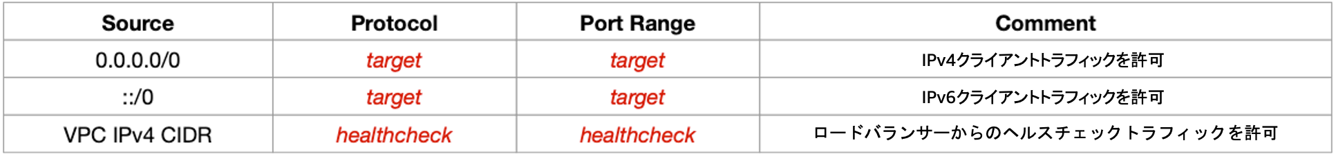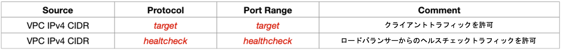 IPターゲットで推奨されるセキュリティグループの設定は以下の通りです。