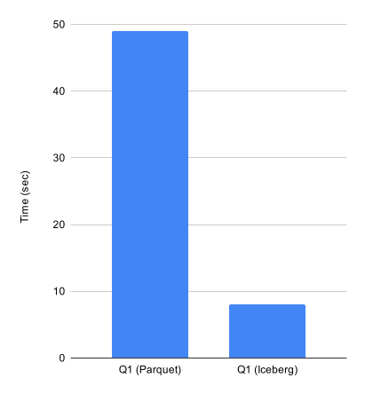70 TB ほどのログの中から特定リクエスト ID のレコードを抽出するクエリを Athena で 実行したところ、Parquet では 49 秒かかっていたのに対して同じパーティション粒度の Iceberg では 8 秒で完了しました。