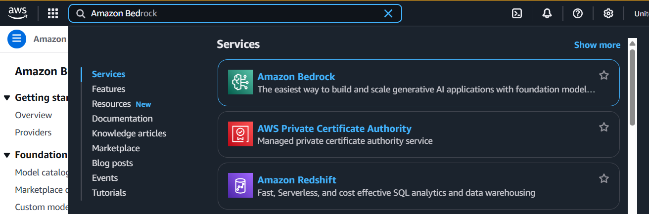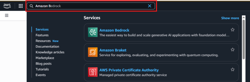 AWS マネジメントコンソールで Amazon Bedrock のメニューにアクセスします。