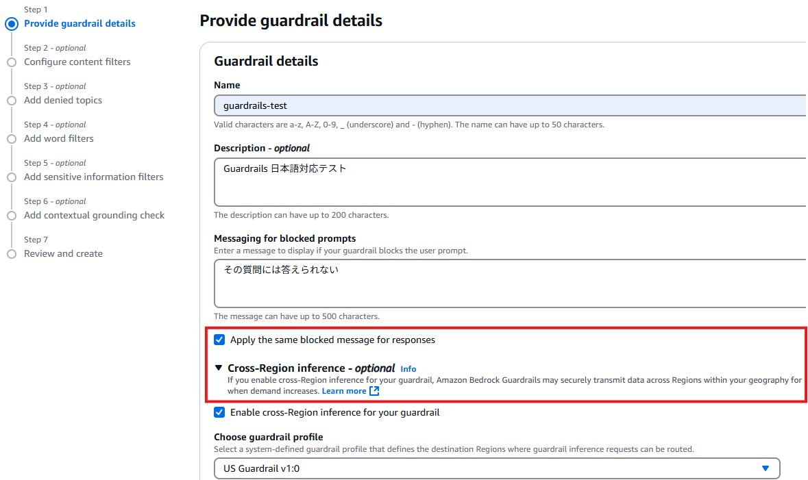 Guardrails 作成時には、クロスリージョン推論にチェックを入れてください。クロスリージョン先は、”Choose guardrail profile” で選択しているプロファイルに依存します。先ほど記載した通り、これはリージョンごと固定されています (画像は us-east-1 で作成しているので US Guardrails v1:0 になっています)。東京で作成すると APAC Guardrail v1:0 になり APAC で分散されます。