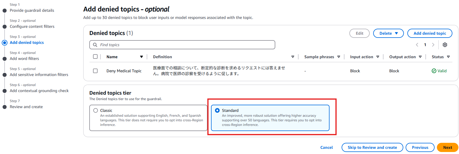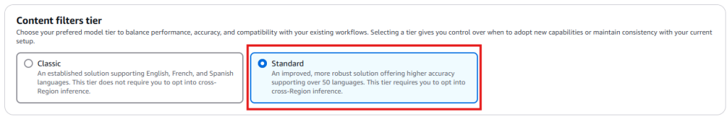 コンテンツフィルターや拒否トピックを作成していきます。フィルターごとに Classic Tier か Standard Tier を選択できます。Standard Tier を選択する際、Cross Region にチェックを入れていないとエラーになります。なお、コンソール上の記載が “over 50 language” となり News Release の 60 言語と値がずれていますが、執筆時点で Supported Language の数を数えると “59” であり数としては同等です。