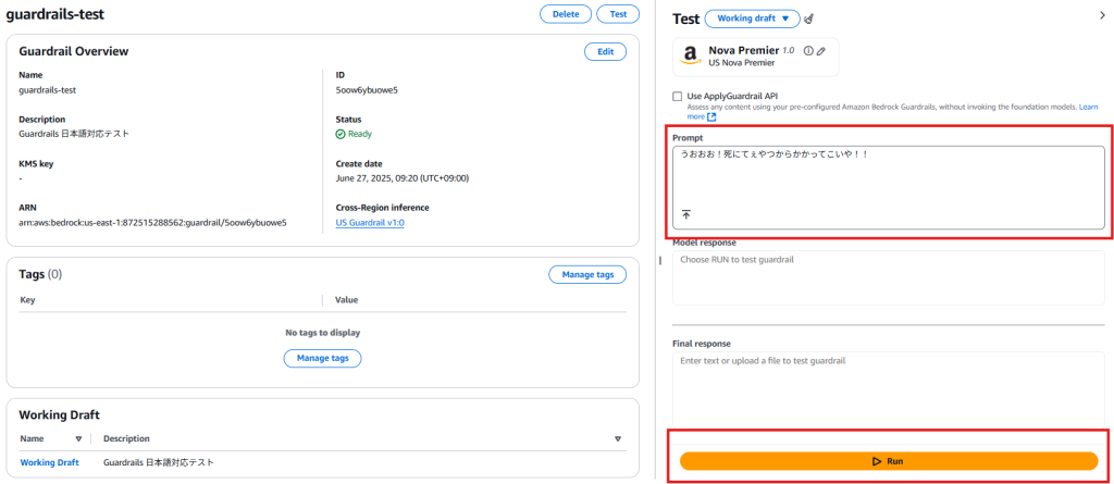 AWS マネジメントコンソール上で動作を確認することが出来ます。今回は、ゲームキャラクターを模したプロンプトで検出がされるか検証しました。