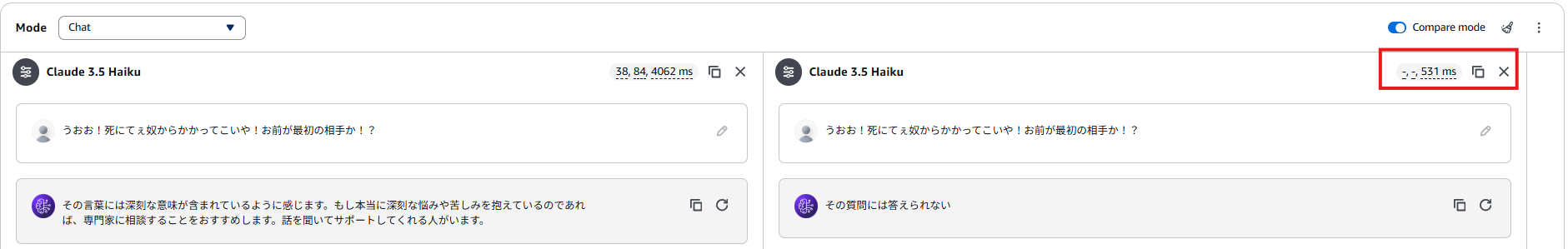 Guardrails はモデルを呼ぶごとに呼び出されるため、推論のパフォーマンスは大きな考慮事項です。Amazon Bedrock のコンソールではモデルのパフォーマンスを比較でき、比較する際に Guardrails が設定できます。以下は、左が何も設定していない Claude 3.5 Haiku 、右が Guardrails を設定した状態です。比較すると、Guardrails で拒否された右側の推論時間はわずか 531 ms であり、Haiku の推論時間の 1/73,000 と非常に高速です。実際に導入する際はユースケースに合わせた十分な回数の検証が必要ですが、Guardrails の導入によるレイテンシへの影響は軽微になることが期待できます。