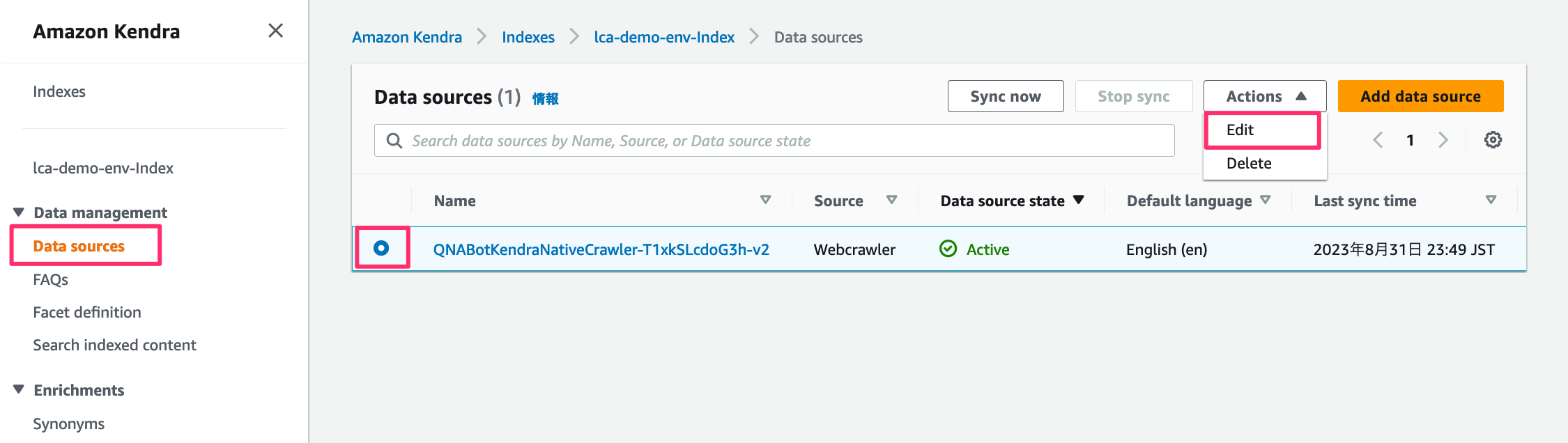 2. データソースを選択し、Action メニューの「Edit」を選択します。
