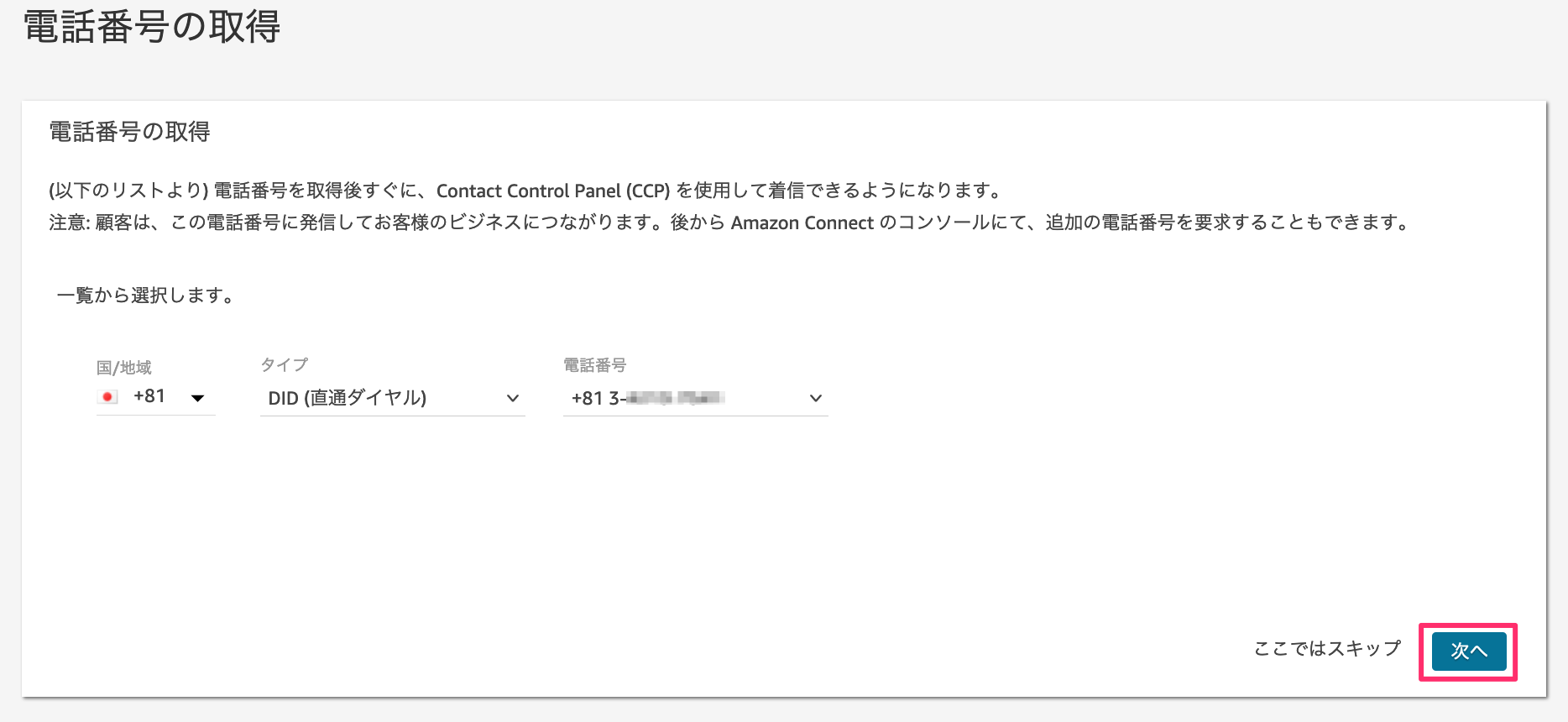 9. 電話番号を選択して、「次へ」をクリックします。