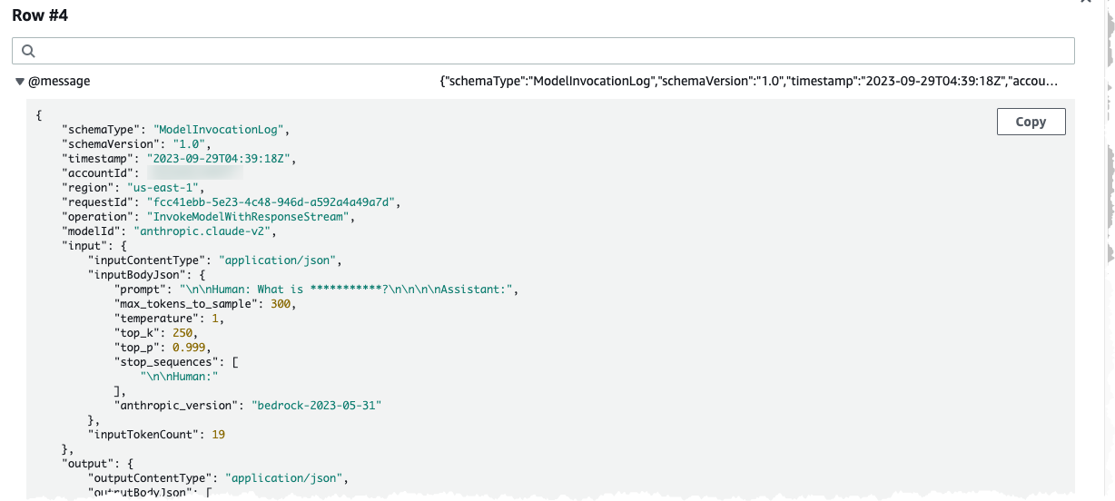図 8: プロンプトフィールドで IP アドレスをマスクした JSON での単一モデル呼び出しのログイベント