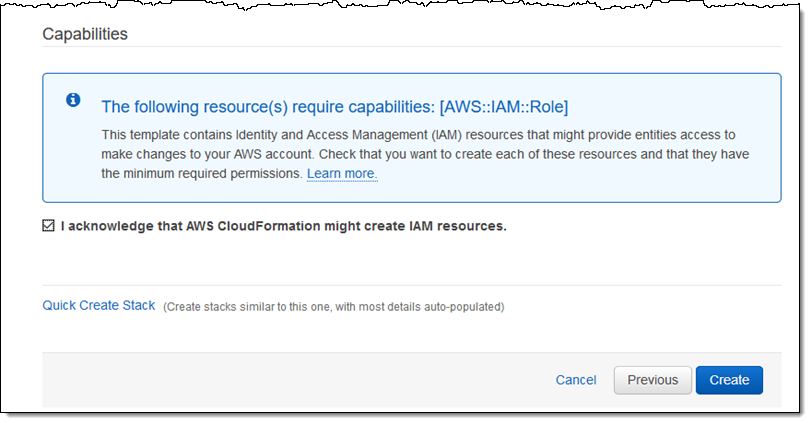 スタックがロールを作成することを承認し、[作成] をクリックして先に進みます。