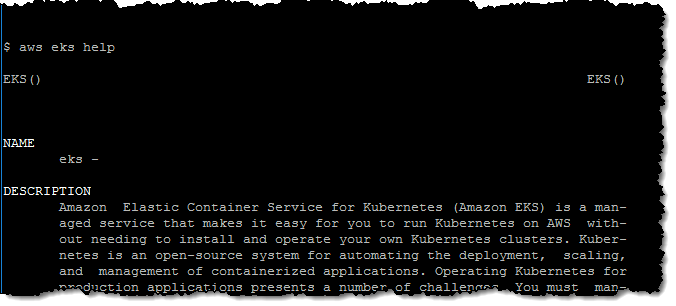 設定プロセスを完了させるにあたって、AWS コマンドラインインターフェース (CLI) の最新バージョンで実行しているか確認します (古いバージョンで実行した場合は、 eks コマンドは利用できません)。