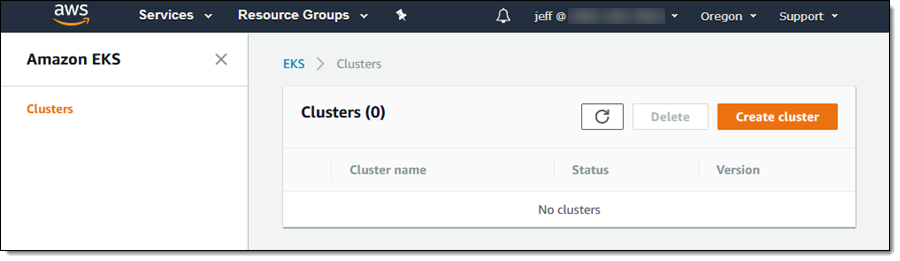 管理者権限 (Heptio Authenticator の動作上の理由により、ルート認証情報は使用できません) を持つ IAM ユーザーで EKS コンソールにログインし、[クラスターの作成] をクリックします。