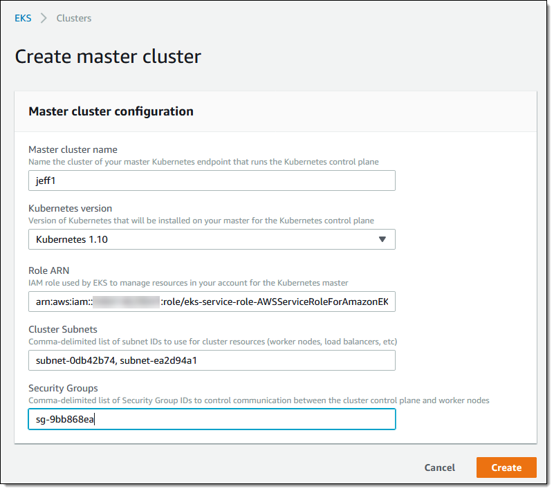 クラスターの名前とともに (Kubernetes はサブネットのタグ付けに依存するため、VPC を作成したときの名前と一致している必要があります)、VPC のサブネット ID および セキュリティグループ ID の両方を入力して、[作成] をクリックします。