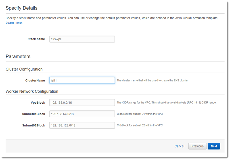 Amazon EKS 入門ガイド に指示に従い、IAM ロールの作成を始めます。Kubernetes はこの IAM ロールを引き受け、Elastic Load Balancers のような AWS リソースを作成するために使用します。このロールが作成されたら、すべてのクラスターで使用できます。入門ガイドで言及されているテンプレートを使用して、CloudFormation スタックを作成すればいいだけです。