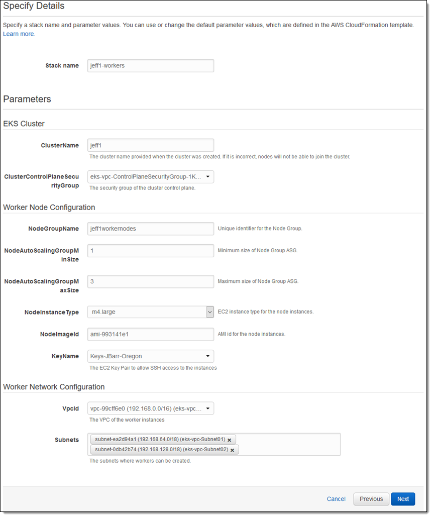この時点で、マスター VPC および Kubernetes コントロールプレーンの設定が完了しました。今は、ワーカーノードをいくつか作成できる状態です (EC2 インスタンス)。繰り返しになりますが、これは CloudFormation テンプレートを使用しています。