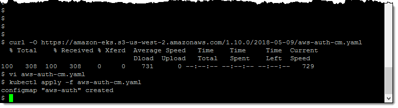 ここで、ワーカーノードがクラスターとのジョイン方法を認識できるように、コンフィギュレーターマップを設定する必要があります。マップをダウンロードして、スタックから NodeInstanceRole の ARN を追加し、設定を適用します。