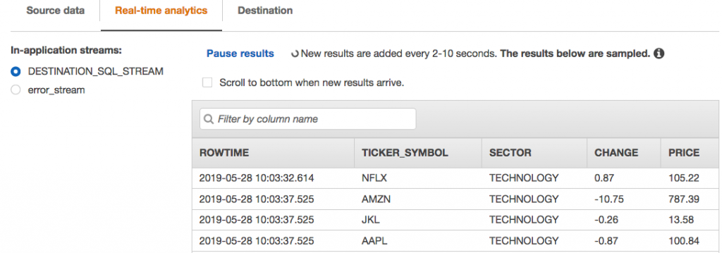 8. ”DESTINATION_SQL_STREAM” が作成され、クエリを実行できました。