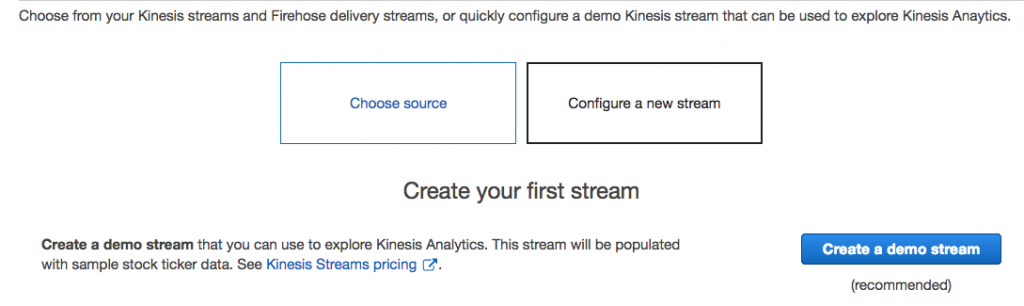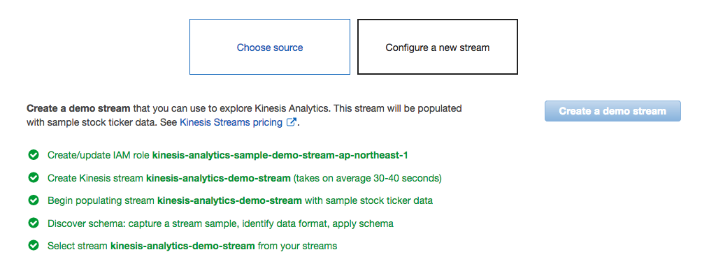 4. ”Configure a new stream” を選択し、Kinesis Data Streams の項目にて、[Create a demo stream] を実行し、デモ用のストリームデータを作成します。