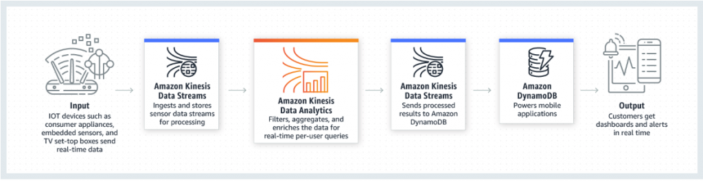 IoTデバイスが送信したデータをリアルタイムで処理する場合にも有効です。工場内の産業機器から取得したストリームデータを Kinesis Data Analytics で変換、集計、およびフィルタリングすることも可能です。例えば、センサーから取得した値が特定の閾値を上回った場合に、Kinesis Data Analytics を用いて、即時にアラートを発行することができます。あるいは、IoTデバイスから取得したデータストリームに、機械学習のモデルを適用して推論を実行するといったことも可能です。