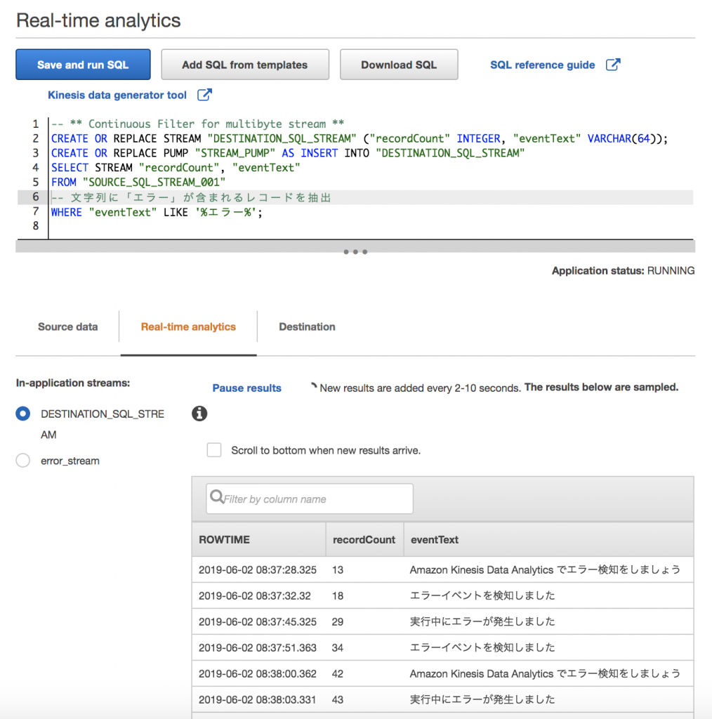 Kinesis Data Analytics では、UTF-8 でエンコードされたマルチバイト文字を扱うこともできます。ここでは、日本語のマルチバイト文字が含まれるストリームデータに対して、「エラー」という文字列が含まれるレコードを抽出する SQL クエリを実行した画面の例をご紹介します。
