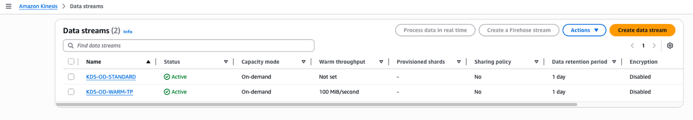 ウォームスループットの動作を示すために、AWS アカウントでコミット料金を有効にし、「KDS-OD-STANDARD」と「KDS-OD-WARM-TP」の 2 つのオンデマンドストリームを作成しました。「KDS-OD-WARM-TP」ストリームには 100 MiB/s のウォームスループットを設定し、「KDS-OD-STANDARD」はウォームスループットなしの通常のオンデマンドストリームのままにしました。次のスクリーンショットのとおりです。