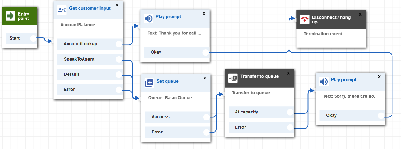 - 終了 / 転送 から 切断/ハングアップ をグリッドにドラッグし、プロンプトの再生 ブロックとつなげます。メッセージが再生された後、通話は切断されます。