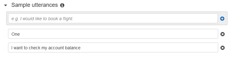 - “Check my account balance” (クォートを含めないでください) のようなサンプルの発話を追加し、+ アイコンを選択します。