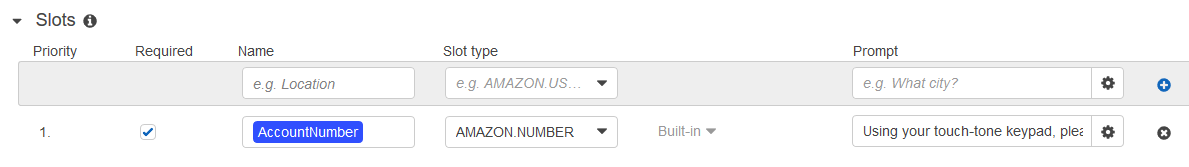 - Slots の下で、AccountNumber という名前のスロットを追加します。