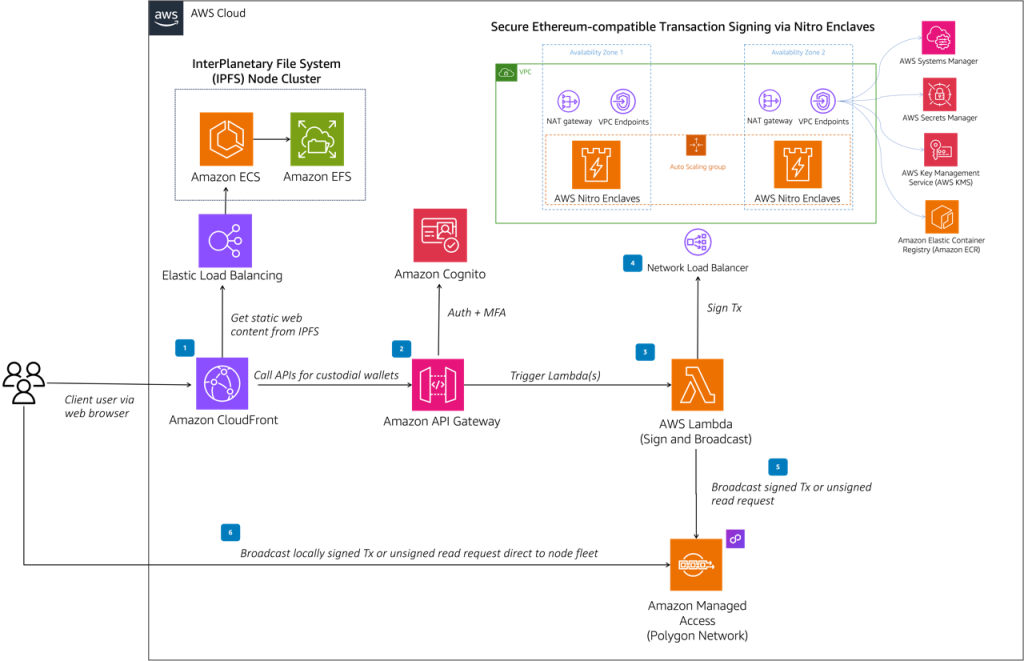 - たとえば、ユーザーが Polygon ネットワーク上のデジタル資産の取引をリクエストすると、API Gateway は AWS Lambda 関数をトリガーします。この関数は取引に署名してもらい、AMB Access Polygonを介してブロックチェーンにブロードキャストします。