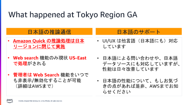 今回の GA により、Amazon Quick の推論処理通信が国内に閉じるようになり、企業データを生成 AI で活用する際のセキュリティ・コンプライアンスが大きく向上しました。