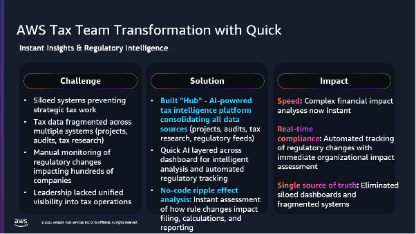 続いて AWS Sr. WW Specialist, Amazon Quick, WWSO Generative AIの Jihwan Ko が、Amazon 社内で 20 万人以上が Amazon Quick を利用し、30 万以上のワークフロー自動化を実現している実績を紹介しました。導入にあたっては、ステップバイステップの展開、ユーザー理解に基づくユースケース選定、チェンジマネジメントの徹底、社内ユースケースライブラリの構築という 4 つの戦略を実行しました。具体的な事例として、Amazon カナダの税務チームが Amazon Quick を使い、複数システムに散在していた税務データを統合ダッシュボードに集約し、コードを書かずに情報の可視化と分析を実現した事例を紹介しました。